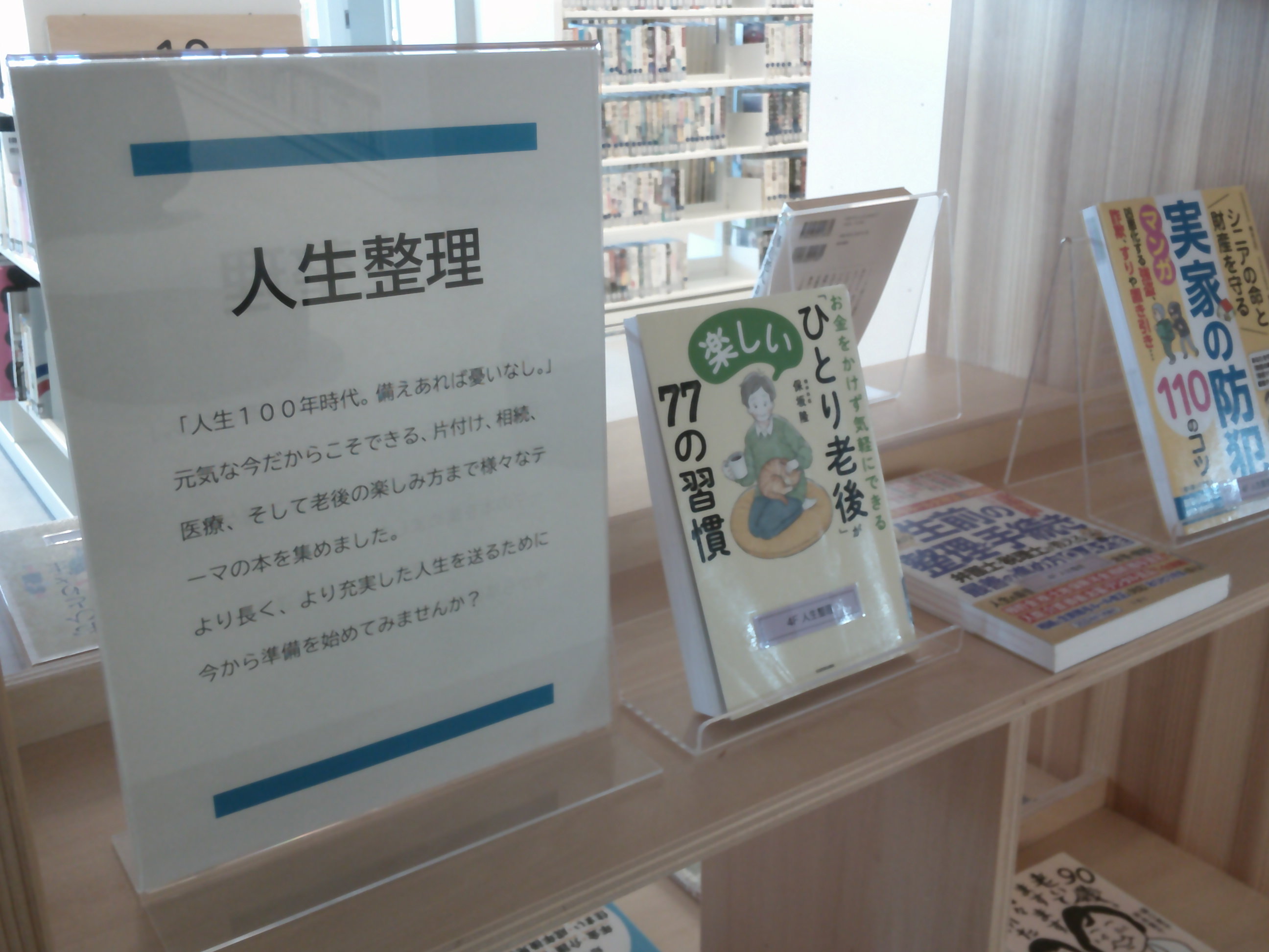 人生整理 「人生100年時代。備えあれば憂いなし。」元気な今だからこそできる、片付け、相続、医療、そして老後の楽しみ方まで様々なテーマの本を集めました。より長く、より充実した人生を送るために今から準備を始めてみませんか? 場所:4F 担当:N